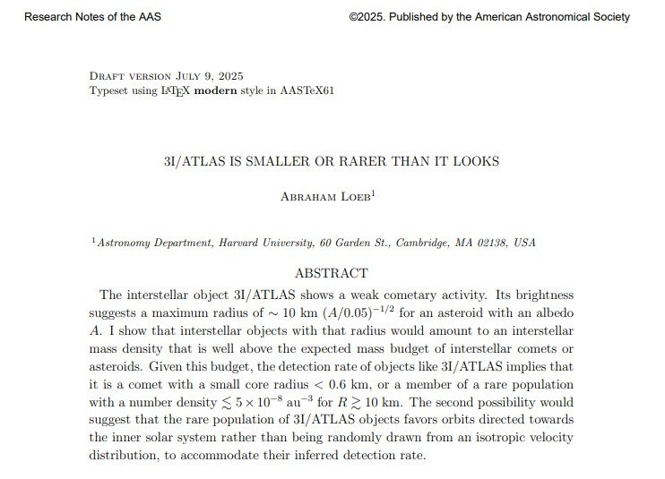 Loeb, Abraham. “3I/ATLAS is smaller or rarer than it looks.” Research Notes of the AAS 9, no. 7 (2025): 178.