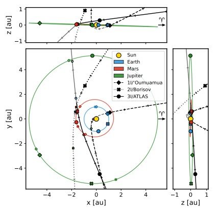 Bahwa gambar diatas yang merupakan dinamika lintasan heliosentrik, tampak bahwa ketiga objek memiliki jalur hiperbolik terbuka (garis hitam), berbeda dengan orbit elips tertutup planet-planet seperti Bumi (biru), Mars (merah), dan Jupiter (hijau). Segmen abu-abu menunjukkan bagian lintasan di bawah bidang ekliptika. Panah arah gerak memperlihatkan vektor kecepatan sesaat terhadap Matahari, dan pada 3I/ATLAS panah tersebut hampir berlawanan arah rotasi planet, konsisten dengan inklinasi ~175° (retrograde). Titik kuning menandai Matahari, sedangkan tanda bulat berwarna menunjukkan posisi planet saat deteksi dan pendekatan terdekat masing-masing objek.