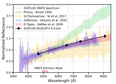 Dapat dilihat pada gambar di atas bahwa spektrum pantulan cahaya (reflectance spectrum) 3I/ATLAS menunjukkan kemerahan moderat, di mana intensitas pantulan meningkat pada panjang gelombang lebih besar. Pola ini sejalan dengan 1I/‘Oumuamua dan 2I/Borisov, menandakan adanya komposisi permukaan kaya senyawa organik kompleks yang telah terproses oleh radiasi kosmik. Hasil fotometri multi-band (g, r, i, z) dari FTN juga konsisten dengan data spektroskopi SNIFS, menunjukkan kestabilan pengamatan. Dibandingkan dengan Centaur Pholus dan asteroid tipe D, warna 3I/ATLAS tergolong merah gelap alami, bukan logam atau buatan, memperkuat bahwa objek ini merupakan komet tua aktif antar bintang dengan koma lemah akibat sublimasi es oleh pemanasan Matahari.