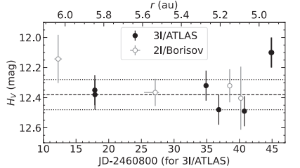 Dapat dilihat pada gambar di atas bahwa magnitudo absolut (Hᴠ) 3I/ATLAS tampak relatif stabil terhadap jarak heliosentrik (r) selama fase pra-perihelion. Titik-titik hitam mewakili data hasil precovery dari Zwicky Transient Facility (ZTF) antara 22 Mei–18 Juni 2025, dengan garis putus-putus menunjukkan median Hᴠ dan garis titik-titik sebagai simpangan baku fotometrik.