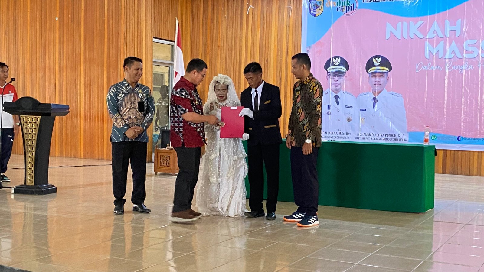 Foto : Bupati Bolmong Utara Sirajudin Lasena menyerahkan akta perkawinan disaksikan Wakil Bupati Moh. Aditya Pontoh dan Kadis Dukcapil Samidin Korompot.