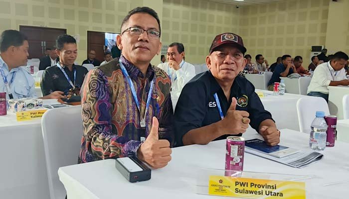 Ketua PWI Sulut Voucke Lontaan bersama Sekretaris PWI Sulut Dr Merson Simbolon yang merupakan peserta kongres PWI 2025 menyampaikan ucapan selamat kepada Cak Munir yang telah terpilih secara demokrasi dalam Kongres tersebut.