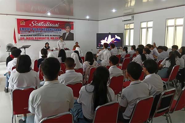 Menurut Maya Rumantir empat pilar kebangsaan harus terus kita sosialisasikan . Seperti di SMK Negeri 3 Manado siswanya bersemangat dan serius mengikuti materi sosialisasi.