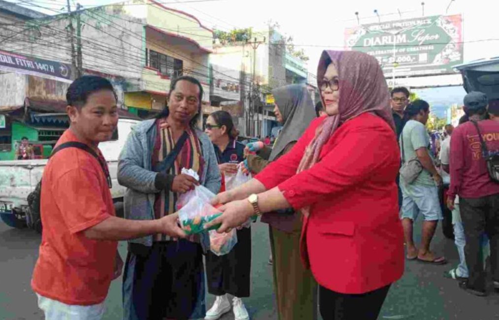 Kegiatan sosial ini bertajuk berbagi berkah Ramadhan, DPC PDIP Kotamobagu membagikan ratusan paket takjil berupa nasi bersama lauk kepada para pengendara bentor yang melintas dibundaran tugu patung permesta depan Paris Superstore Kotamobagu.