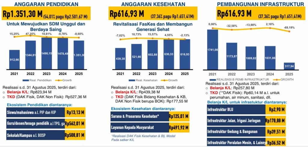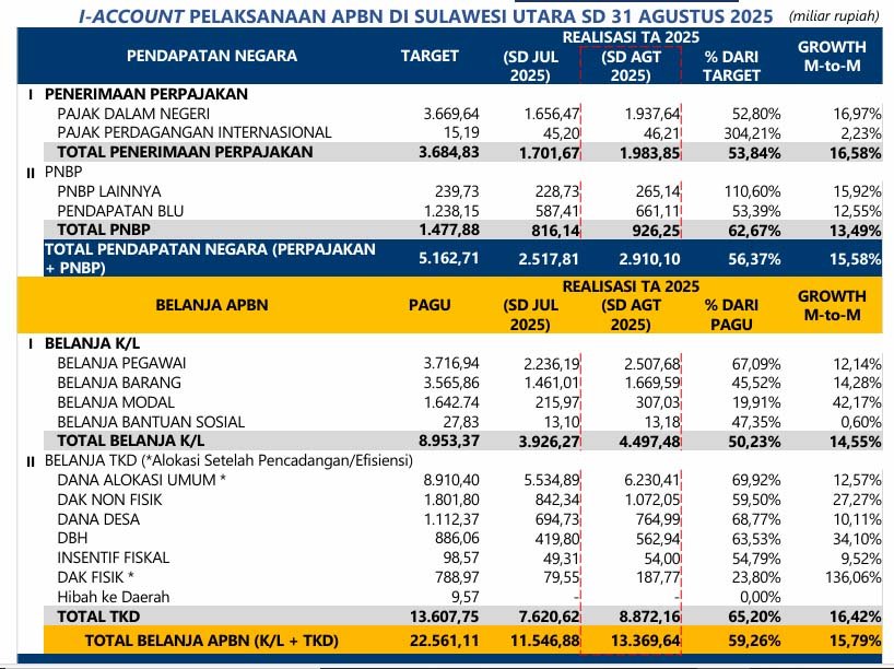 Heri Utomo menjelaskan, sampai dengan31 Agustus 2025, Pendapatan Negara terealisasi sebesar Rp2.910,10miliar (56,37% daritarget), tumbuh15,38% secara m-to-m dibanding bulan Juli 2025. Sementara itu, Realisasi Belanja APBN (Belanja TKD & Belanja K/L) sebesar Rp13.369,64 miliar (59,26% dari pagu), tumbuh 15,79% m-to-m di sepanjang bulan Agustus 2025. Sehingga, terdapat defisit Rp10.459,51 miliar.
