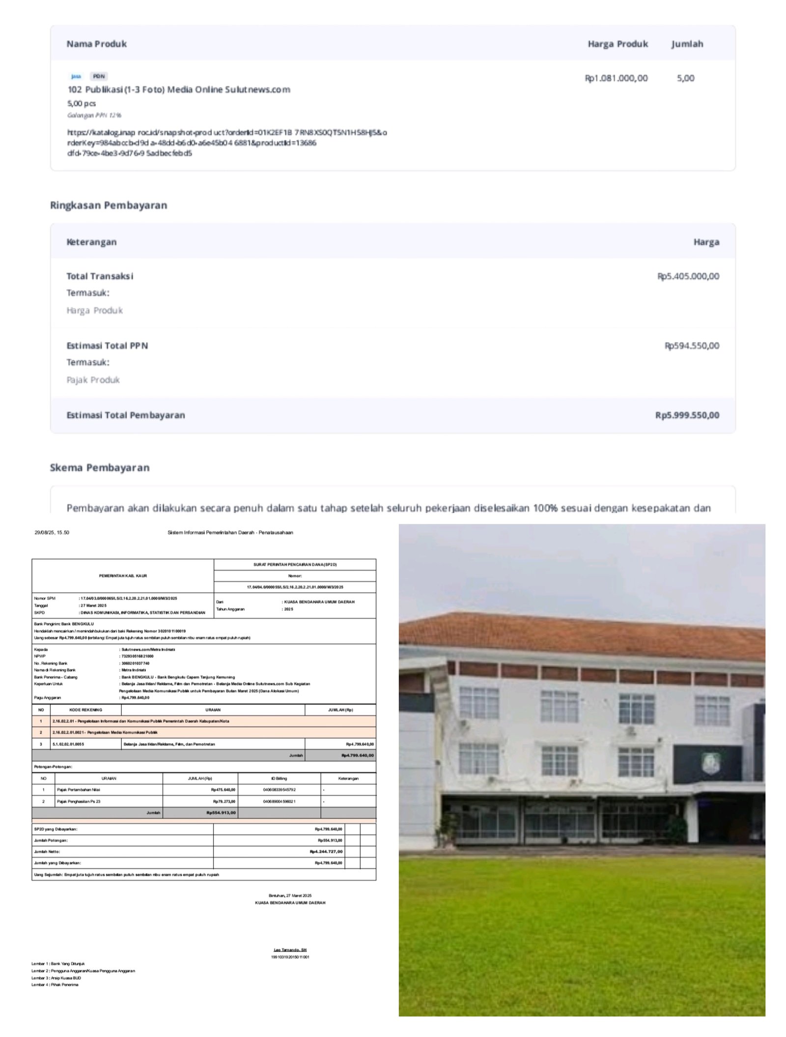 Pihak Kominfo kabupaten kaur saat di konfirmasi Altri mengakui bahwa mereka sudah melakukan pembayaran pada tahap pertama namun bukan ke rekening perusahaan yang tercantum di e-katalog, kemudian yang tahap kedua Kominfo kabupaten kaur kembali lakukan pemesanan dan sudah dikerjakan seratus persen oleh media sulutnews.com akan tetapi kesalahan serupa kembali terjadi dengan memindahkan pencairannya ke media lain dengan alasan atas permintaan wartawan yang bersangkutan.