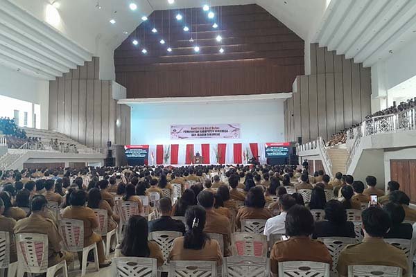 Minahasa,Sulutnews.com – Bupati Minahasa Robby Dondokambey, SSi, MAP, bersama Wakil Bupati Minahasa, Vanda Sarundajang, S.S, memimpin Apel Kerja Perdana Awal Bulan yang dirangkaikan dengan Ibadah Oikumene yang dipimpin Pdt. DR. Adolf Katuuk Wenas, M.Th. selaku Wakil Ketua bidang misi dan hubungan kerjasama BPMS GMIM. Kegiatan ini berlangsung di Gedung Wale ne Tou Minahasa pada Senin (10/3/25).