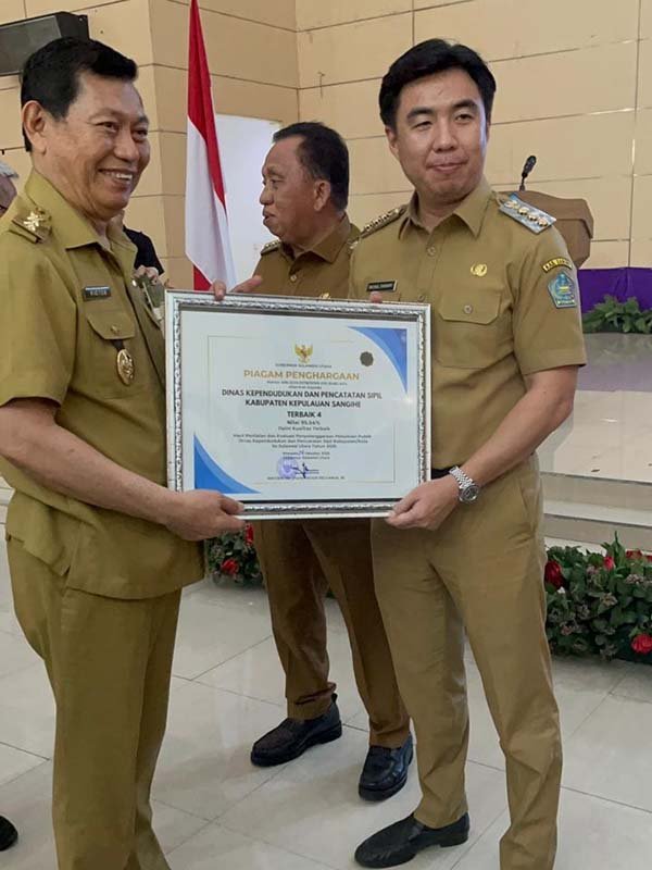 Selain itu, Kepala Dinas Kependudukan dan Pencatatan Sipil Daerah Kabupaten Kepulauan Sangihe, Davidson Djarang, juga meraih peringkat ke-4 dengan nilai 85,79 pada penilaian kinerja Pejabat Tinggi Pratama Dukcapil kabupaten/kota semester I tahun 2025, sebagaimana ditetapkan melalui Keputusan Menteri Dalam Negeri Republik Indonesia.