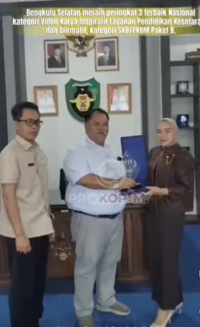 Sulutnews.com Bengkulu Selatan – Bupati, H. Rifai Tajudin didampingi Plt.Kadis Dikbud kabupaten Bengkulu Selatan Lusi Wijaya M.Pd menerima penghargaan Juara 3 Nasional Video Inspiratif dari Kepala SPNF–SKB Bengkulu Selatan di Ruang Kerja Bupati, Kamis (04/12/25).