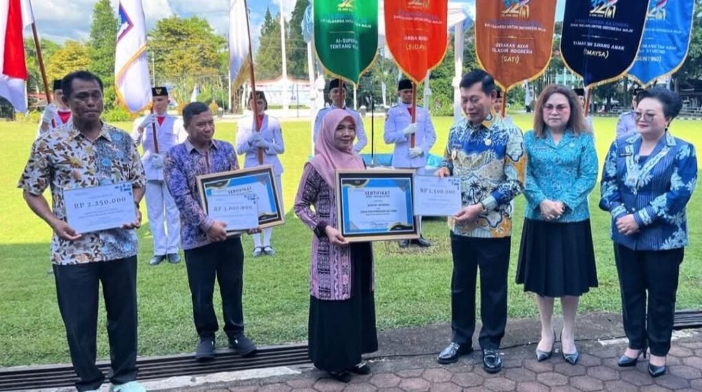 Piagam penghargaan diserahkan langsung oleh Wakil Gubernur Sulut, Victor Mailangkay, kepada Kepala madrasah, Intan Safitri Mokodompit, S.Pd., M.Pd. dalam apel peringatan Hari Keluarga Nasional (HARGANAS) di Lapangan Kantor Gubernur, Jumat, 4 Juli 2025.