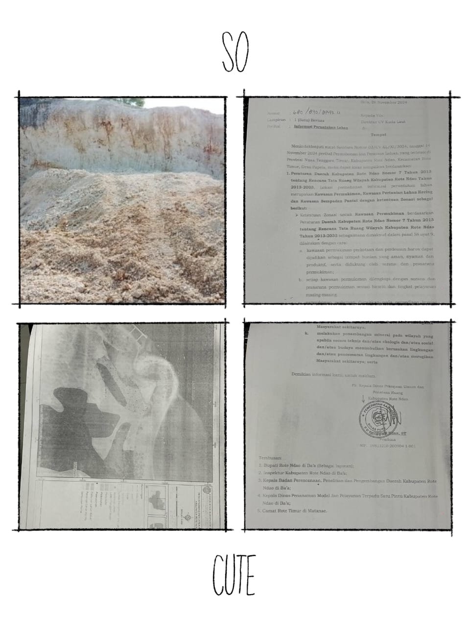 Sebagai bukti, Haji Ardani Laduma menunjukkan surat dari Dinas Pekerjaan Umum dan Penataan Ruang Kabupaten Rote Ndao yang dikeluarkan pada 26 November 2024. Surat tersebut merespons permohonan CV Kuda Laut terkait perataan lahan di Desa Papela dan menyatakan bahwa lokasi tersebut berada dalam kawasan permukiman, pertanian lahan kering, dan sempadan pantai sesuai dengan Peraturan Daerah Kabupaten Rote Ndao Nomor 7 Tahun 2013 tentang Rencana Tata Ruang Wilayah Tahun 2013–2033