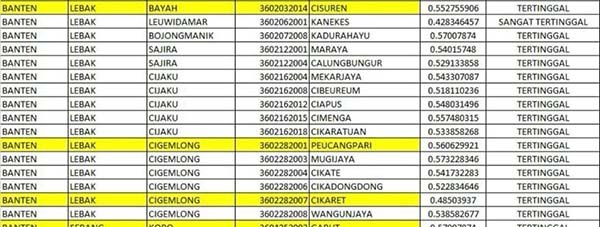 Menurutnya, Desa-desa tersebut berada di Kecamatan Bayah di Desa Cisuren, Kecamatan Leuwidamar di Desa Kanekes (sangat tertinggal), Kecamatan Bojongmanik di Desa Kadurahayu.