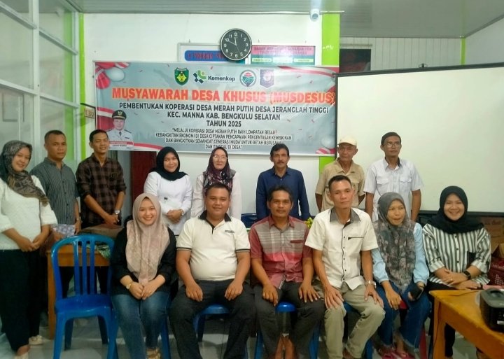 Pembentukan Koperasi desa merah putih jeranglah tinggi kecamatan manna ini di hadiri, Kepala desa dan perangkat, dinas perindagkop, bhabhin khamtibmas, bhabinsa, perwakilan camat pino raya, serta masyarakat desa jeranglah tinggi. Acara ini berjalan lancar hingga terbentuknya pengurus. (Diki)