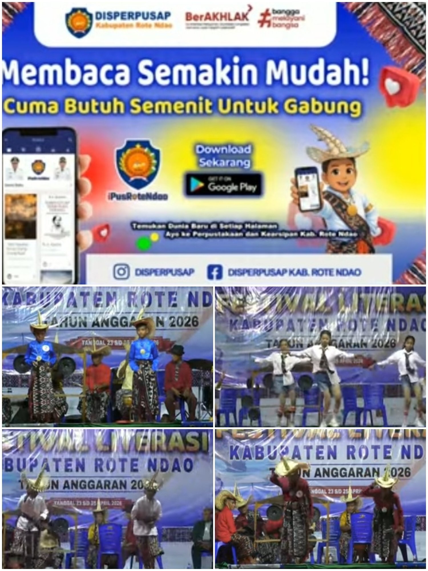 Rote Ndao.Sulutnews.com – Malam penutupan Festival Literasi Baca yang berlangsung pada 25 April 2026 menjadi momen yang tak terlupakan bagi seluruh yang hadir. Kegiatan ini tidak hanya bertujuan menumbuhkan dan mempromosikan budaya gemar membaca di tengah masyarakat, tetapi juga menjadi wadah berharga untuk menghidupkan kembali serta menampilkan kekayaan warisan budaya daerah. Salah satu penampilan yang paling dinanti dan menghiasi rangkaian acara tersebut adalah Tari Foti, tarian khas yang menjadi kebanggaan masyarakat Rote Ndao.