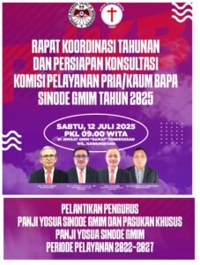 MANADO,Sulutnews.Com – Komisi Pria Kaum Bapa Sinode GMIM melalui suratnya yang ditandatangani Ketua Komisi Pnt Ir .Mouris Mantiri MM, dan Sekertaris Pnt Reza Kh.H,C Rumambi mengharapkan kehadiran seluruh Komisi Pria Kaum Bapa yang ada di Aras Jemaat, Wilayah, bahkan Sinode serta Panji Yosua untuk bersama – sama hadir dalam kegiatan Rapat Koordinasi dan Persiapan konsultasi Komisi Pelayanan Pria Kaum Bapa 2025 serta Pelantikan Pengurus Panji Yosua Sinode GMIM dan Pasukan Khusus.Pamji Yosua Sinode GMIM Periode Pelayanan 2022 – 2027.