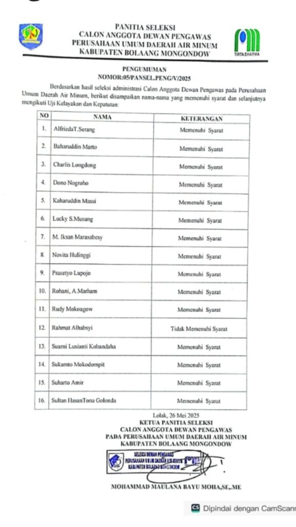 BOLMONG – Panitia Seleksi Calon Dewan Pengawas Perusahaan Umum Daerah (Perumda) Air Minum mengumumkan hasil seleksi administrasi bagi para pelamar yang telah mendaftar. Sebanyak 15 orang dinyatakan memenuhi syarat untuk melanjutkan ke tahapan berikutnya, yakni Uji Kelayakan dan Kepatutan.