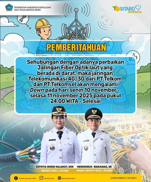 Sitaro.sulutnews.com – Pemerintah Kabupaten Sitaro melalui Dinas Komunikasi dan Informasi (Diskominfo) resmi mengumumkan adanya gangguan jaringan telekomunikasi yang akan terjadi pada wilayahnya mulai malam tanggal 10 November hingga 11 November 2025.