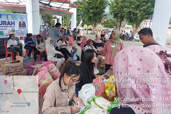 Bolsel, Sulutnews.com. Gubernur Sulut Mayjen TNI ( Purn) Yulius Selvanus bersama Istri Anik Fitri Wandriani Selaku Ketua TP. PKK dalam kunjungan Safari Ramadhan dihari ketiga di Bolmong Raya, Sabtu (15/3) sore menghadiri Kegiatan Gerakan Pangan Murah (GPM) dan buka puasa di Molibagu Kabupaten Bolsel dan memberikan 2.500 kg berss gratis kepada warga miskin menjelang hari Raya Idul Fitri.