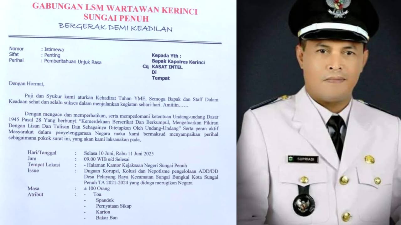 Menindaklanjuti berbagai temuan dan laporan masyarakat, gabungan LSM dan insan pers berencana menggelar aksi demonstrasi di depan Kantor Kejaksaan Negeri (Kejari) Sungai Penuh pada Selasa (10/6) dan Rabu (11/6). Mereka mendesak aparat penegak hukum segera memeriksa Supriadi terkait dugaan korupsi dana desa yang nilainya ditaksir mencapai ratusan juta rupiah.