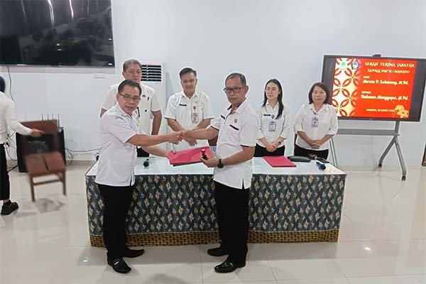 Foto – Serah Terimah Kepsek SMP Negeri 1 Manado dari Mervin Lolowang ( kiri) Kepada Rahman Manggopa ( kanan)