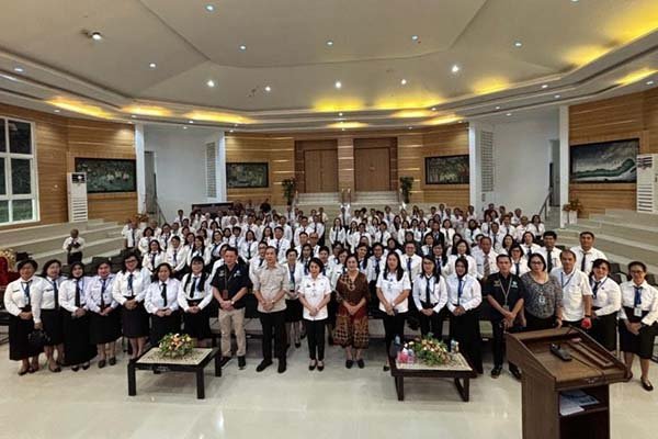 Foto – Kepala BPMP Sulut Febry Dien ST.M.Inf. TecH dan Kadis Dikda Sulut Dr Femmy Suluh M.Si ( tengah) bersama 130 Kepsek Dalam Acara In Service Trainning