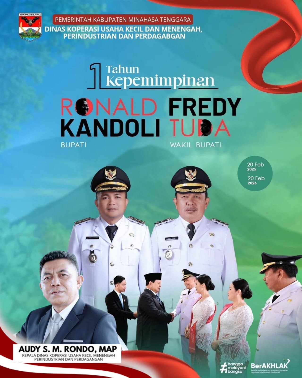 mitra,Sulutnews.com – Kepala Dinas Koperasi Usaha Kecil Menengah, Perindustrian Perdagangan (DKUKMPP) Kabupaten Minahasa Tenggara (Mitra) Audy S.M Ronda,MAP mengucapkan Dirgahayu Kepemimpinan Pertama Bupati Ronald Kandoli dan wakil Bupati Fredy Tuda,Jumat 20 Februari 2026.