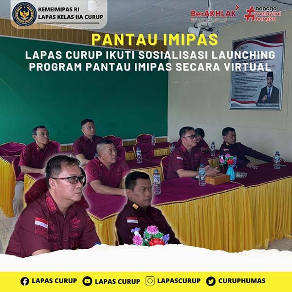 Curup,Sulutnews.com – Kepala Lembaga Pemasyarakatan (Kalapas) Kelas IIA Curup kalapas Curup Ronaldo Devinci Talesa dan seluruh jajaran ikuti kegiatan Sosialisasi Pantau Imipas di lingkungan Kementerian Imipas, secara Virtual bertempat di aula Lembaga Pemasyarakatan Kelas IIA Curup, Kamis, (30/01)