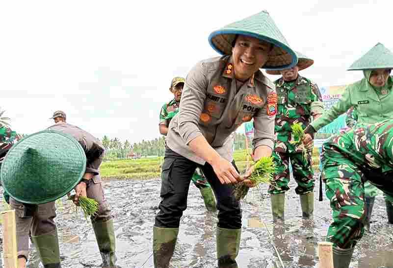 Mereka bersama-sama turun ke sawah menanam padi sebagai wujud nyata sinergi lintas sektor.