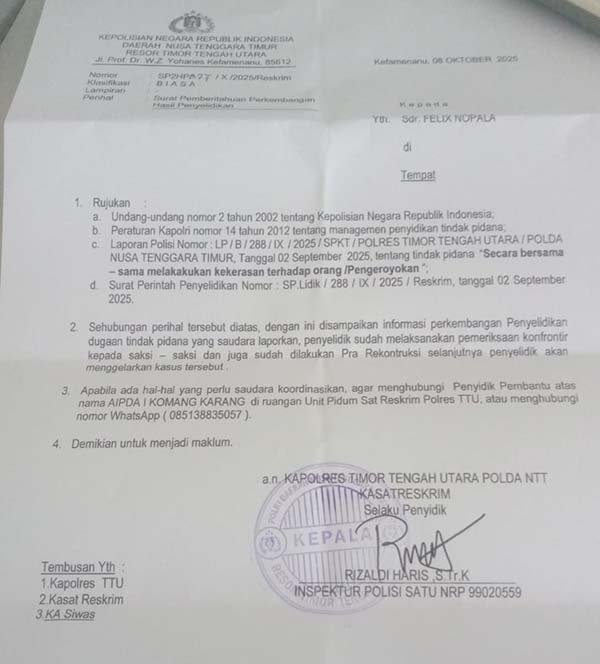 Polres TTU telah mengeluarkan Surat Pemberitahuan Perkembangan Hasil Penyelidikan (SP2HP) kepada pihak terkait, menandakan bahwa kasus ini terus diproses. Selain itu, pihak kepolisian juga telah melakukan pemeriksaan terhadap sejumlah saksi yang diduga mengetahui kejadian tersebut.