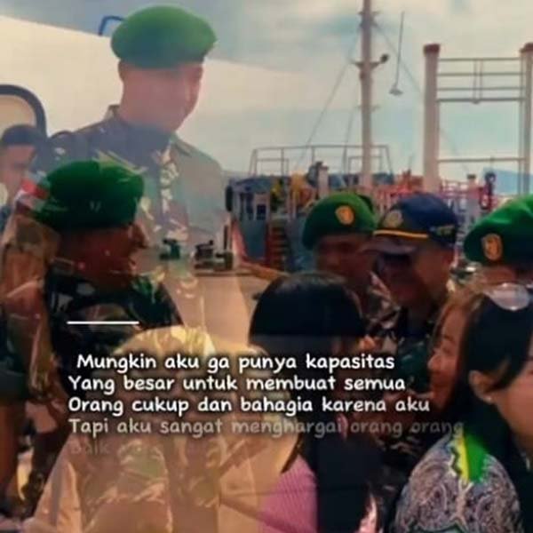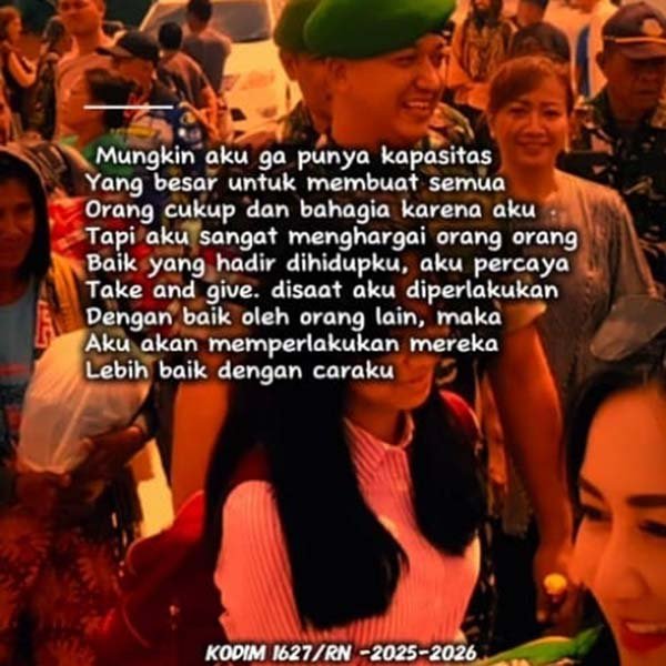 Dalam foto tersebut, terlihat seorang pemimpin dari KODIM 1627/Kabupaten Rote Ndao pada tahun 2025, dikelilingi oleh anggotanya. Yang menarik perhatian adalah kutipan yang menyertainya: “Mungkin aku ga punya kapasitas yang besar untuk membuat semua orang cukup dan bahagia karena aku. Tetapi aku sangat menghargai orang-orang baik yang hadir di hidupku, aku percaya Take and give. Disaat aku diperlakukan dengan baik oleh orang lain, maka aku akan memperlakukan mereka lebih baik dengan caraku.”