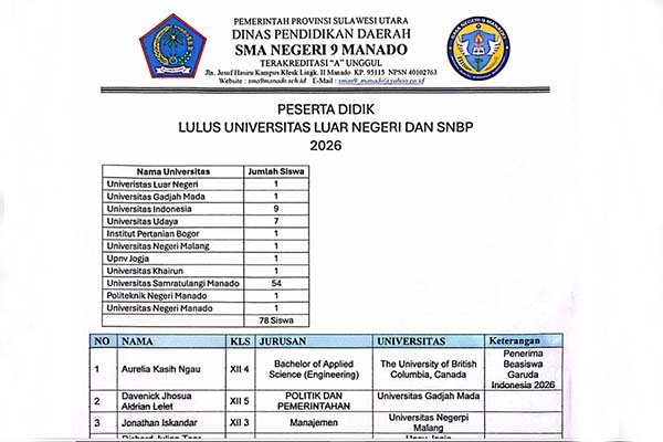 Kepsek Hendra Masie ketika dikonfirmasi Jurnalis Sumikolah Sulut Kamis (2/4) malam membenarkan 78 siswa Eligible lulus SNBP di 11 PT ” Ya betul meski saya hanya Plt sebagai Kepsek SMA Negeri 9 Binsus Manado saya sudah buktikan prestasinya” kata Hendra Masie yang juga menjabat Wakil Sekretaris KONI Sulut serta pelatih olahraga Muangthai Sulut dan wasit Nasional. Sebagai sekolah Akreditasi ” A ” Ungul di Sulut ingin menghasilkan siswa yang cerdas dan berkarakter dan beretika.