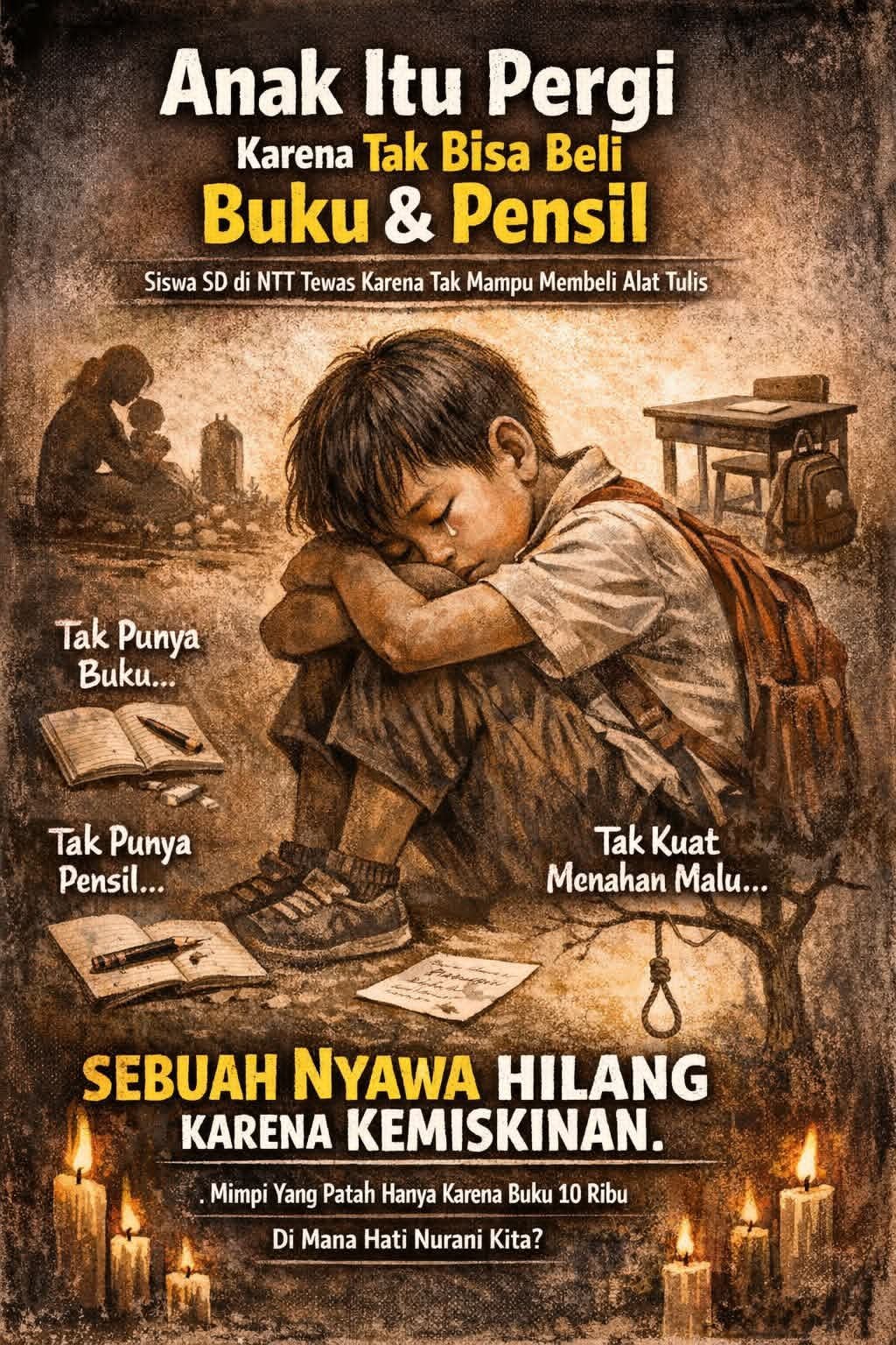 Di tanah Nusa Tenggara Timur, tepatnya di salah satu kabupaten di wilayah ini, cerita seorang anak Sekolah Dasar kini menghentak hati banyak orang. Suara tangisan ibunya masih terdengar di sudut rumah kecil yang pernah menjadi tempat anak itu bermimpi bisa belajar seperti teman-temannya. Hari ini, jika kita mau, buku dan bolpoin bisa dengan mudah dibeli di warung terdekat atau toko alat tulis mana pun—namun nyawa sang anak telah hilang untuk selamanya, tak bisa diganti dengan apa pun.