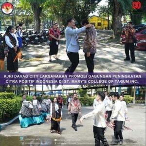 Tagum City Filipina, Sulutnews.com – Konsulat Jenderal Republik Indonesia (KJRI) Davao City terus memperkuat diplomasi publik di Filipina. Hal ini diwujudkan melalui kunjungan kehormatan dan penyelenggaraan kuliah umum di St. Mary’s College of Tagum Inc. (SMCTI), Tagum City, pada Selasa (25/11/2025). Kegiatan tersebut menjadi bagian dari program promosi terpadu untuk meningkatkan citra positif Indonesia di wilayah Mindanao.