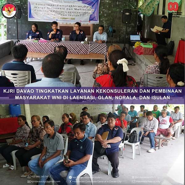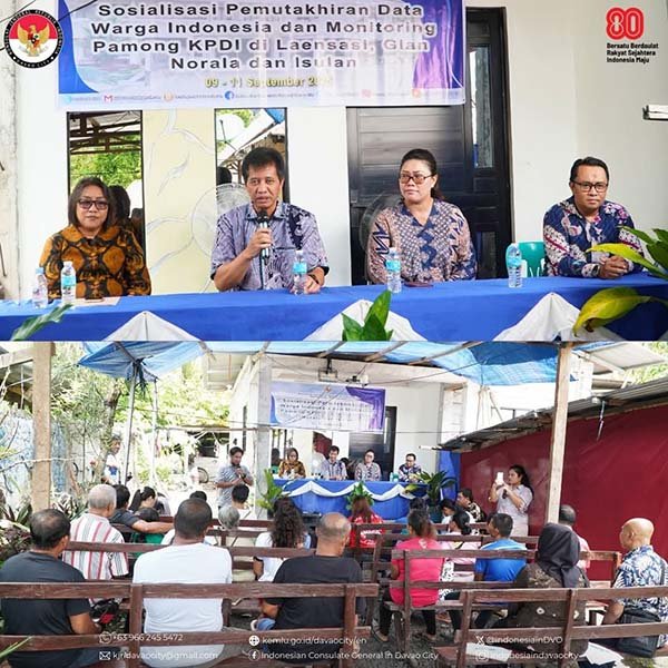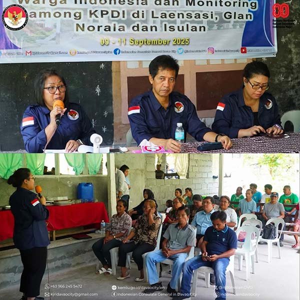 Davao City, Sulutnews.com – Konsulat Jenderal Republik Indonesia (KJRI) Davao City terus memperkuat pelayanan dan perlindungan bagi Warga Negara Indonesia (WNI) di Filipina Selatan. Dipimpin langsung oleh Konsul Jenderal Agus Trenggono, KJRI menggelar rangkaian kegiatan pada 9–11 September 2025 di wilayah Laensasi, Glan, Norala, dan Isulan.