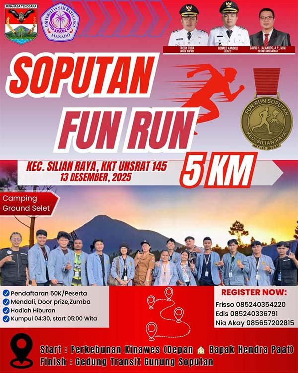 Bertajuk “Soputan Fun Running”, kegiatan ini merupakan hasil kolaborasi apik antara Pemerintah Kecamatan dengan Mahasiswa KKT Universitas Sam Ratulangi (Unsrat) Angkatan 145 yang bertugas di 10 desa di wilayah ini.