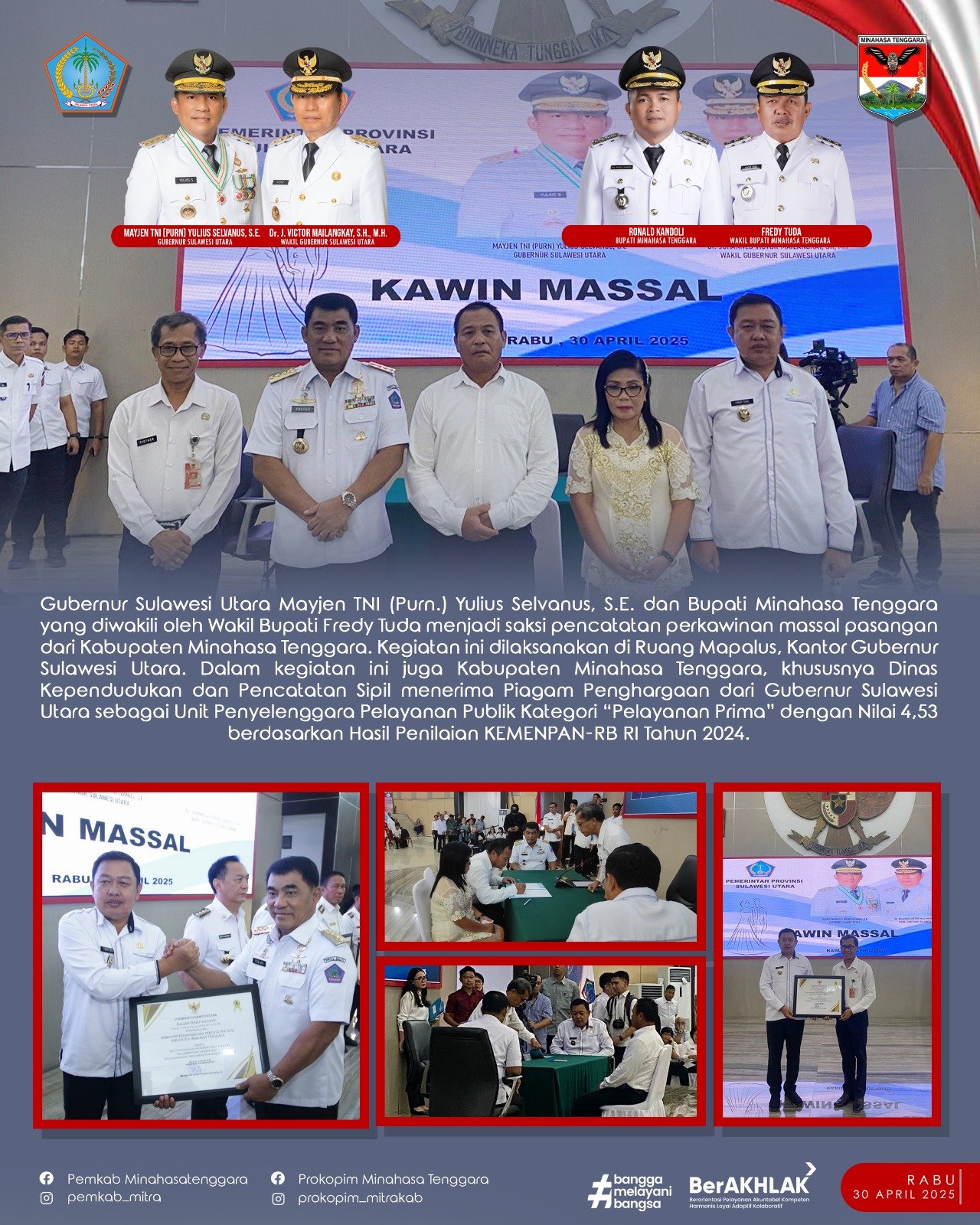 Dimana, berdasarkan hasil penilaian Kemenpan RB pada tahun 2024, Kabupaten Minahasa Tenggara dalam hal ini Disdukcapil Mitra memperoleh penghargaan dari Gubernur Provinsi Sulut Mayjen TNI (Purn) Yulius Selvanus, SE sebagai unit Pelayanan Publik Kategori “Pelayanan Prima”. Diterima langsung oleh Wakil Bupati Fredy Tuda. Bertempat di aula Mapalus Kantor Gubernur Sulut, Rabu 30 April 2025.