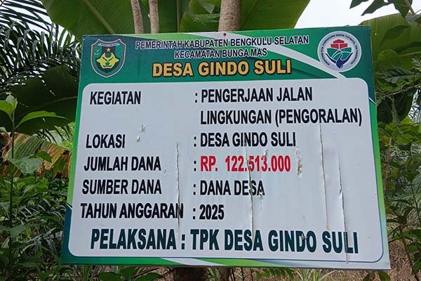 Bengkulu selatan, Sulutnews. com – Tidak hanya irit dalam pengupahan ke masyarakat dalam pengerjakan penggalian siring, kegiatan pengoralan jalan lingkungan Desa Gindo suli Kecamatan Bunga Mas Kabupaten Bengkulu Selatan,yang anggaran nya Rp.122.513.000 juga irit dalam memuat keterangan pada papan merek yang tertempel di sekitar lokasi pengerjaan.