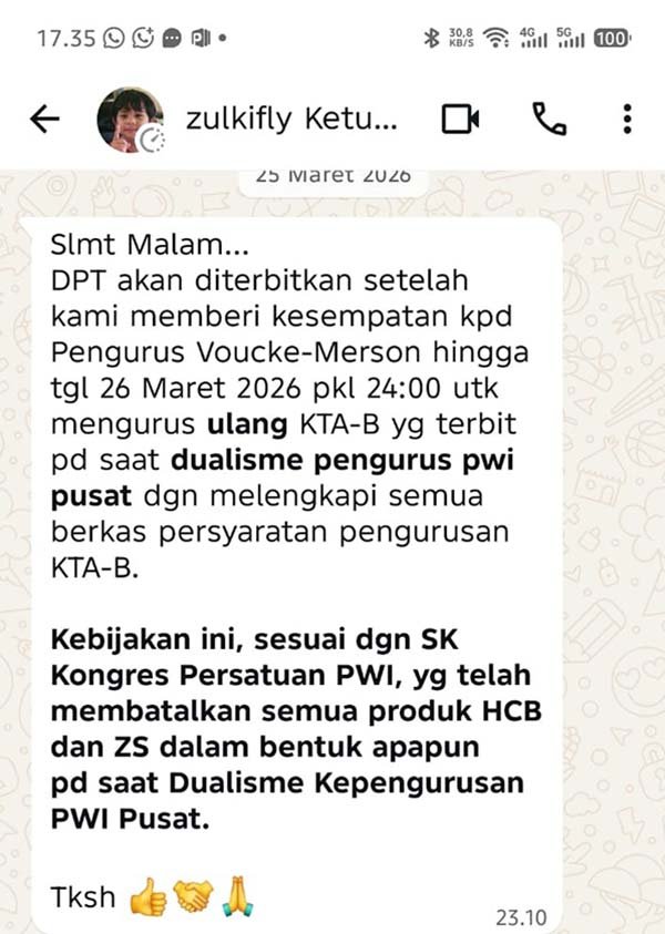 - Rekomendasi Tim Verifikasi pada KTA-B tanggal 30 Oktober 2025, yang dihadiri Zulmansyah Sekedang selaku ketua Tim, Diapari Sebatangkayu, Badar Subur, Merdy Sofansyah dan Yudhi Warman, pada point 4 menjelaskan bahwa “semua KTA yang dibatalkan/tidak sah, boleh kembali mengajukan perpanjangan KTA atau peningkatan Status KTA, sepenjang memenhuhi syara PD/PRT PWI.