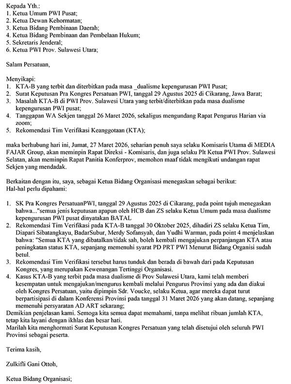 - Kasus KTA-B yang terbit pada masa dualismen di PWI Provinsi Sulawesi Utara kami telah memberikan kesempatan untuk mengajukan/mengurus kembali melalui pengurus Provinsi yang ada dan diakui oleh Kongres Persatuan, yaitu yang dipimpin Sdr.Voucke Lontaan, selaku ketua, agar mereka dapat berpartisipasi di dalam Konferensi Provinsi pada tanggal 31 Maret 2026, sepanjang memenuhi persyaratan AD/ART sekarang.