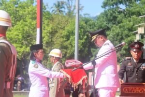 Foto : Bupati Bolmong Utara Sirajudin Lasena menyerahkan bendera merah putih kepada Anastasya Husaini (SMAN 1 Bolangitang).