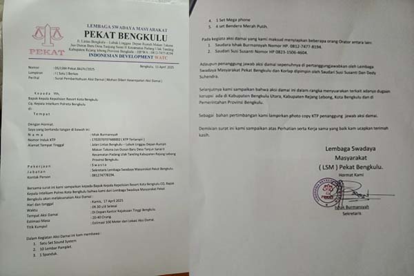 Bengkulu, Sulutnews.com – Lembaga Swadaya Masyarakat ( LSM ) Pekat Bengkulu menyampaikan surat pemberitahuan kepada pihak Kapolres Kota Bengkulu CQ. kepala Intelkam Polresta bengkulu sehubungan LSM Pekat akan menggelar aksi damai di depan Kantor Kejaksaan Tinggi Bengkulu pada hari Kamis, 17 April 2025 yang akan datang.