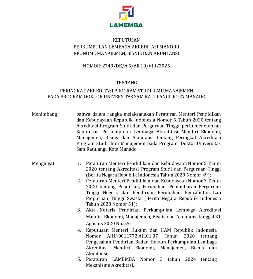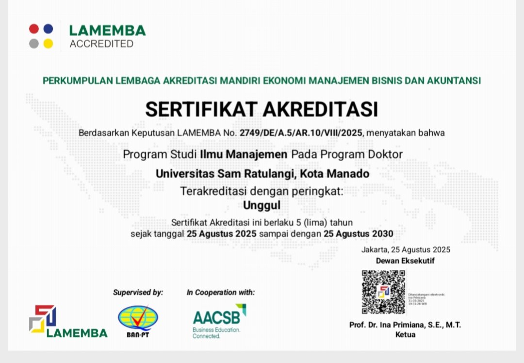 Manado, Sulutnews.com – Program Doktor Ilmu Manajemen (PSDIM) Program Pascasarjana Universitas Sam Ratulangi berhasil meraih akreditasi unggul dari Lembaga Akreditasi Mandiri Ekonomi Manajemen Bisnis dan Akuntansi (Lamemba).