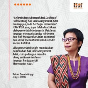 “Keberadaan Peraturan Daerah (Perda) tidak cukup melindungi hak Masyarakat Adat. Negara harus mensahkan RUU Masyarakat Adat,” imbuhnya.