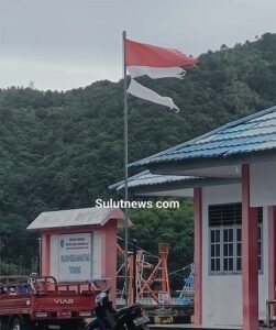 Tahuna, Sulutnews.com – Pemandangan memilukan terlihat di Kantor Syahbandar Pelabuhan Kahakitang, Kecamatan Tatoareng. Bendera Merah Putih yang berkibar di halaman kantor tersebut tampak dalam kondisi tercabik-cabik dan lusuh, namun tetap dibiarkan terpasang.