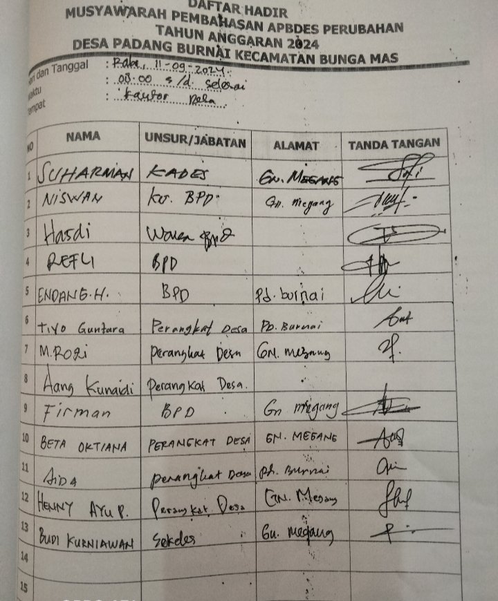 Untuk diketahui pemerintah desa Padang burnai pada tahun 2024 membahas anggaran perubahan dengan BPD setempat tanpa melibatkan unsur masyarakat, hal itu di buktikan dengan adanya bukti tanda tangan daftar hadir musyawarah pada APBDes perubahan desa Padang burnai. (JN)