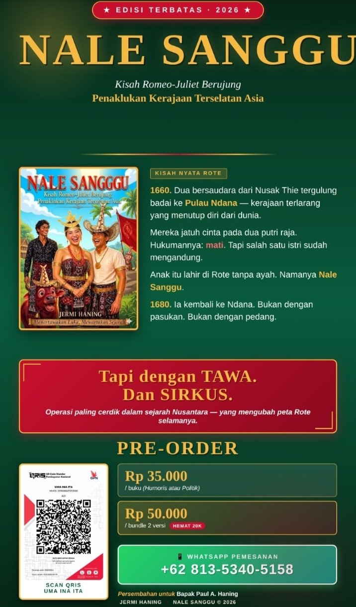 Rote Ndao.Sulutnews.com – Sebuah karya tulis berjudul Nale Sanggu yang mengangkat kisah legendaris asal Rote kini siap diterbitkan dan membuka masa pemesanan awal. Buku ini mengusung tagline “Kisah Romeo-Juliet Berujung Penaklukan Kerajaan Terselatan Asia”, menawarkan sudut pandang unik atas peristiwa sejarah yang turut membentuk identitas masyarakat daerah tersebut.