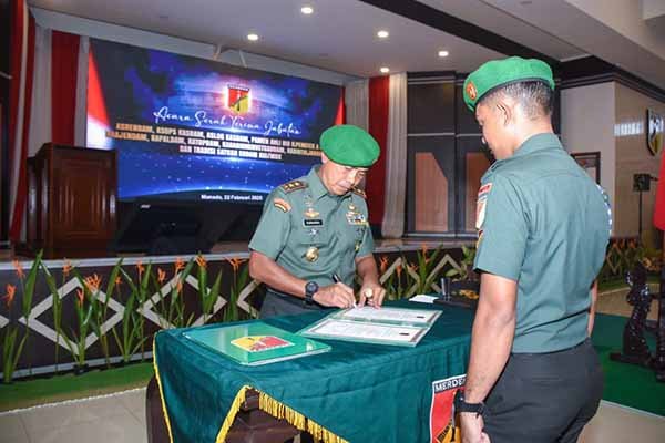 Manado, Sulutnews.com – Pangdam XIII/Merdeka, Mayor Jenderal TNI Suhardi pimpin Serah Terima Jabatan (Sertijab) pejabat di lingkungan TNI AD dilakukan secara berkala untuk menyegarkan organisasi, memastikan kesinambungan kepemimpinan, serta meningkatkan efektivitas kinerja satuan dan Tradisi Satuan bagi sejumlah pejabat utama di lingkungan Kodam XIII/Merdeka. Kegiatan ini berlangsung di Aula Grhadika Jaya Sakti Makodam XIII/Merdeka, Sabtu, 22 Februari 2025.