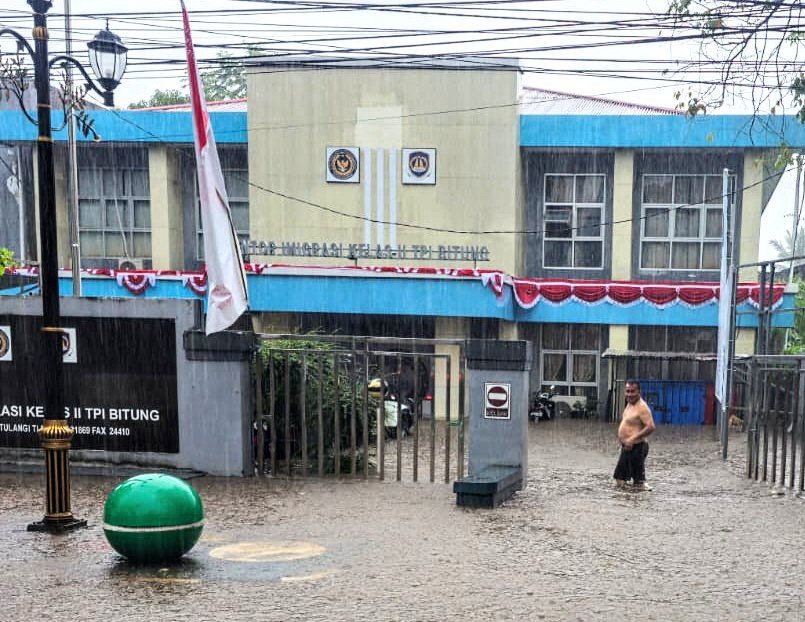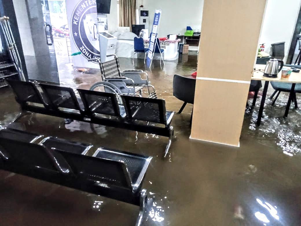 Banjir tersebut terjadi akibat tersumbatnya aliran drainase di sepanjang jalan menuju Kantor Imigrasi, sehingga air meluap dan menggenangi area pelayanan.