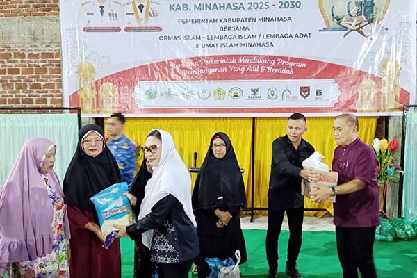 Momen Safari Ramadhan ini, Pemkab Minahasa menyerahkan bantuan Sembako secara simbolis kepada kaum duafa, dan serahkan Wabup Vanda Sarundajang SS bersama Ketua DPRD Minahasa, Drs Robby Longkutoy MM.(*/Merson)