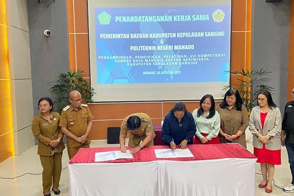 Tahuna, Sukutnews.com – Pemerintah Kabupaten Kepulauan Sangihe menandatangani Nota Kesepahaman (MoU) dan Perjanjian Kerja Sama (PKS) dengan Politeknik Negeri Manado dalam upaya memperkuat sektor pariwisata daerah. Penandatanganan berlangsung di Kampus Politeknik Negeri Manado, Selasa (26/8/2025), dipimpin langsung Bupati Sangihe Michael Thungari.